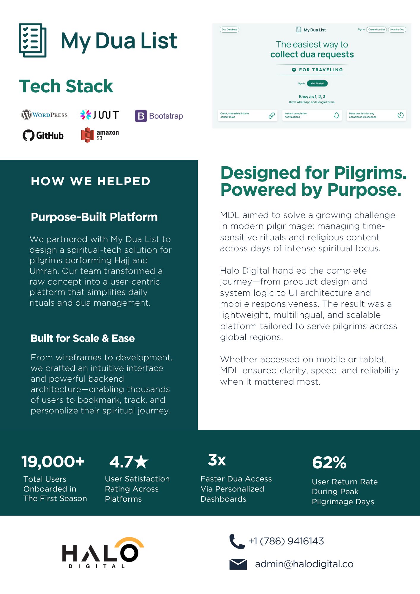 We built a full-stack platform for My Dua List, a spiritual tech initiative designed for Hajj and Umrah pilgrims. Our team handled everything from user flows and back-end logic to UI/UX and scalability — ensuring a smooth experience across all devices. The result was a powerful and intuitive system that scaled to serve thousands of users during peak pilgrimage season.